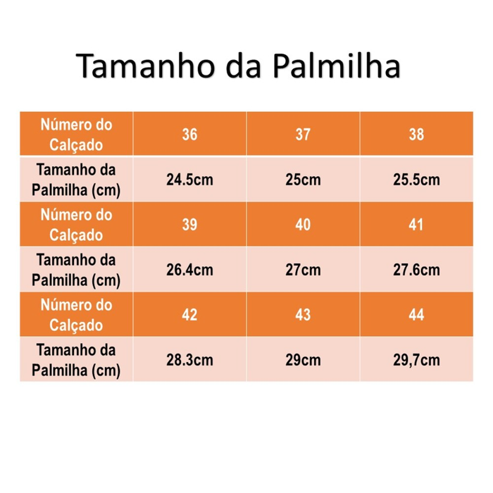 Nela você encontra a tabela com o tamanho da palmilha interna. Basta medir a palmilha de um calçado que você já use — do calcanhar até o dedão — e comparar com nossa tabela.